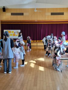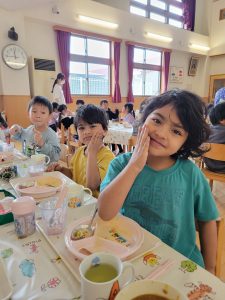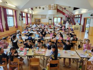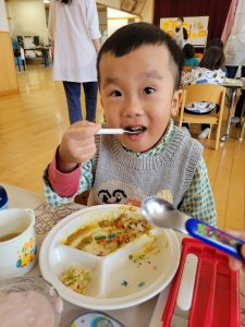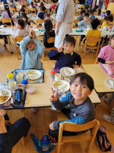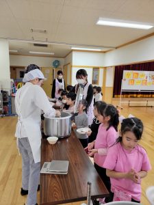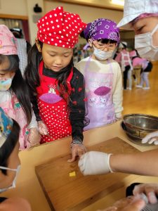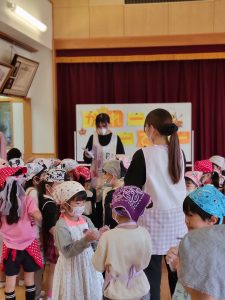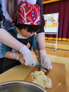 5歳児は野菜の下処理、4歳児はデザート作りを担当。