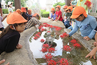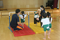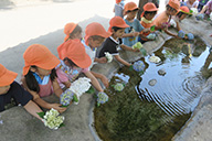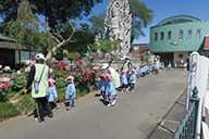 また、園庭をはじめ、お寺の境内や遊歩道を散歩したり、5歳児は近くのふるさとの森・ネーブルパークへ出かけたりもします。![]()
